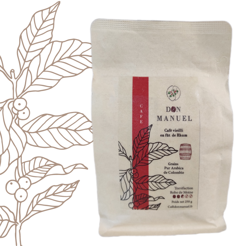 Vendu exclusivement en grains , afin de vous faire profiter du mélange des fragrances de café et Rhum au moment de moudre les grains, de sentir des arômes avant de déguster ce café 100% arabica de Colombie.